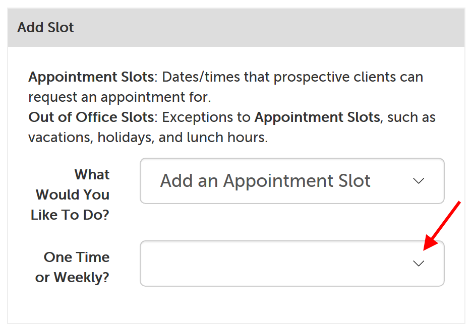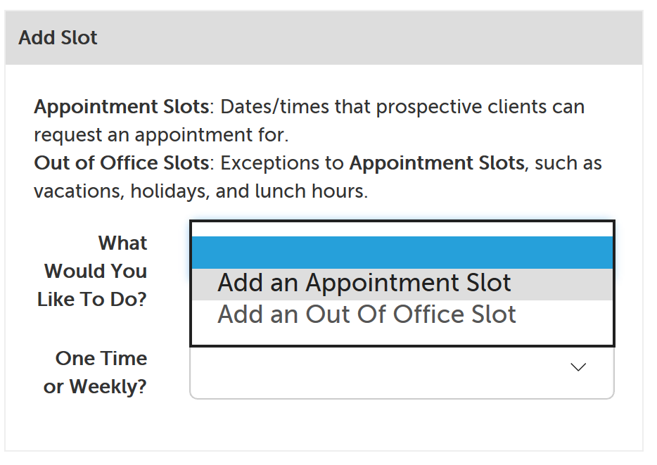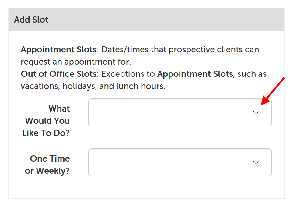 2. Click on the dropdown next to "What Would You Like To Do?" and select "Add an Appointment Slot".