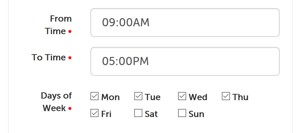 4. Click on the "From Time" field to have the timepick appear. Click a starting hour and then select minute value, in your account's time zone. Click "AM" or "PM" to indicate which is applicable.