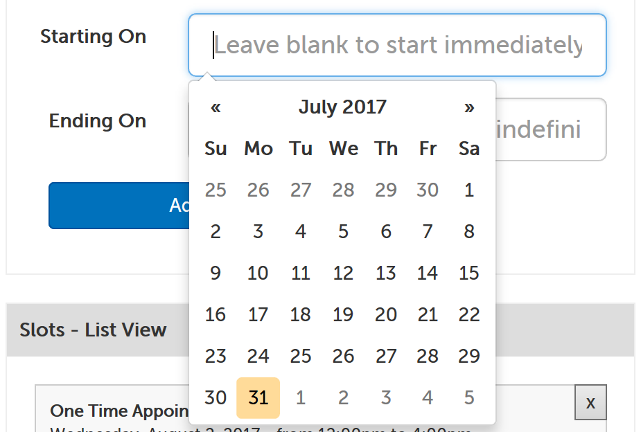 7. Click on the "Starting On" field to make the datepicker appear, and select the date the recurring appointment slot should start on. (Leave blank to start immediately.)