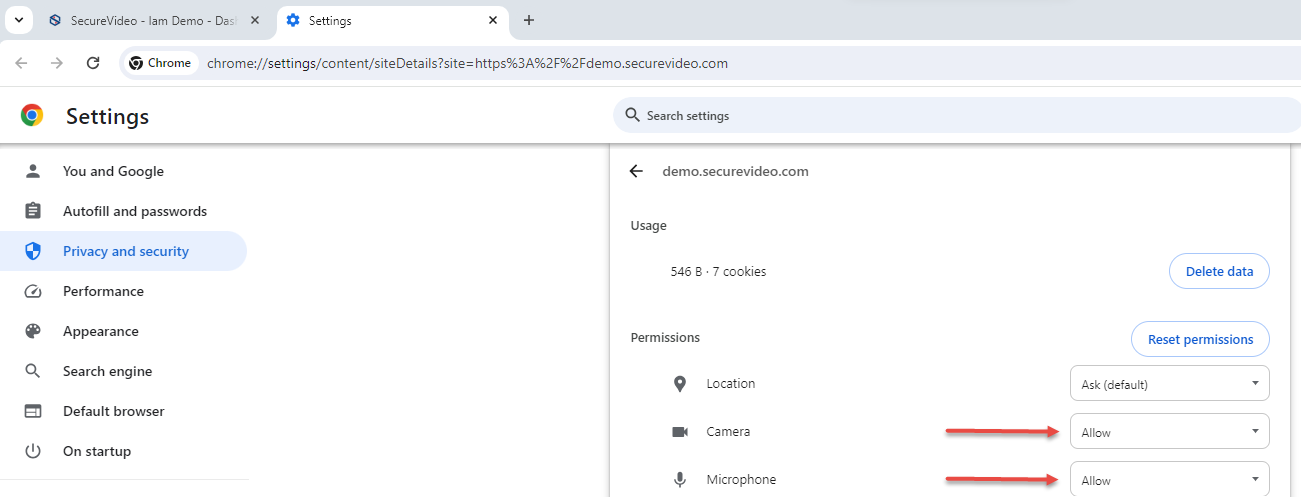 5. Make sure for Camera and Microphone it's set to "Ask":