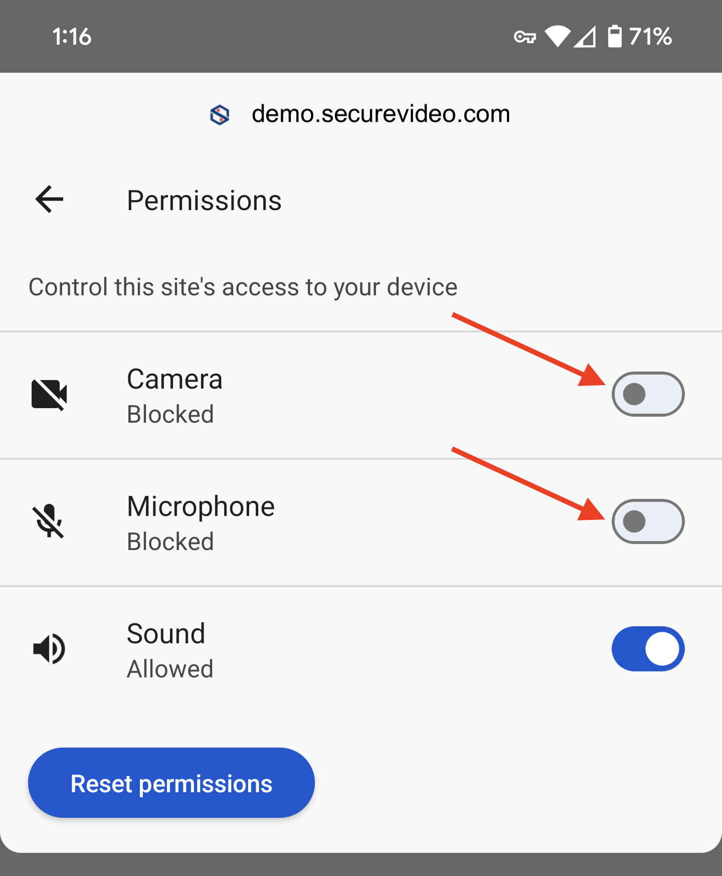 3. Tap on the toggle for "Camera" and "Microphone" to unblock them.