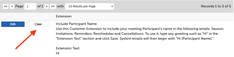 2. Available Custom Text options will be displayed along with a description of its function, and the current text used for that extension (if used). Click the "Clear" button to remove an extension from use. This will immediately delete the customized extension. (You will only see a button to "Clear" the extension if it is in use)