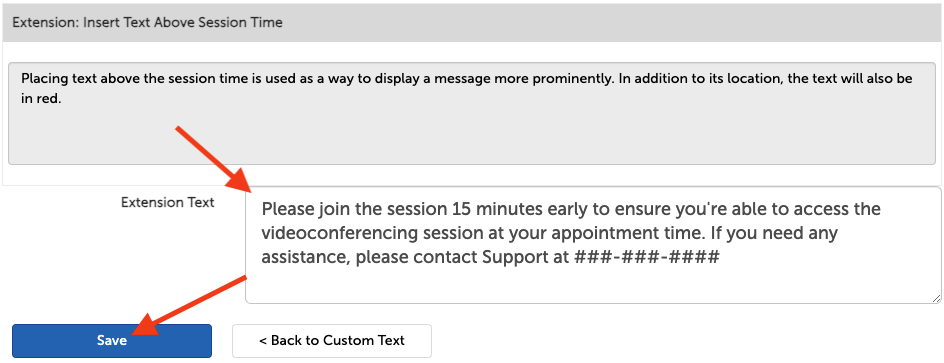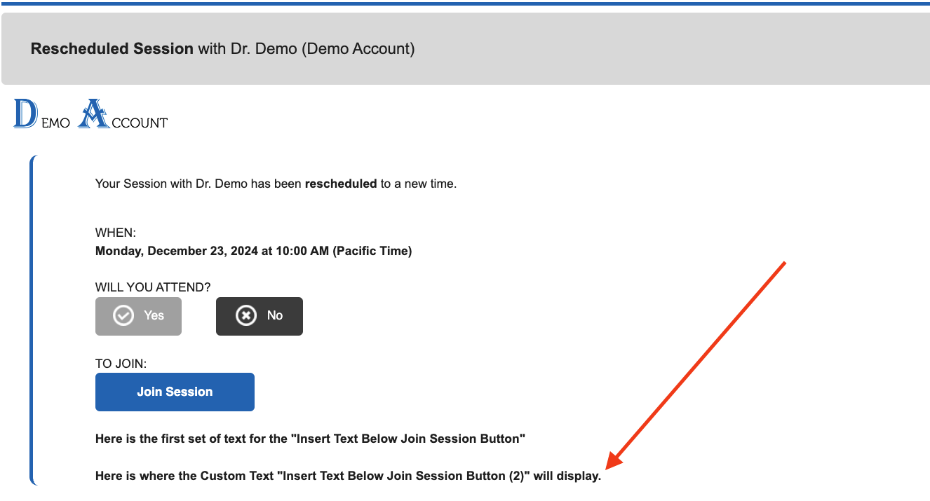Custom text entered here will display in boldface below both the "Join Session" button and the initial "Insert Text Below Join Session Button" on invitations, reschedules, and reminder emails.