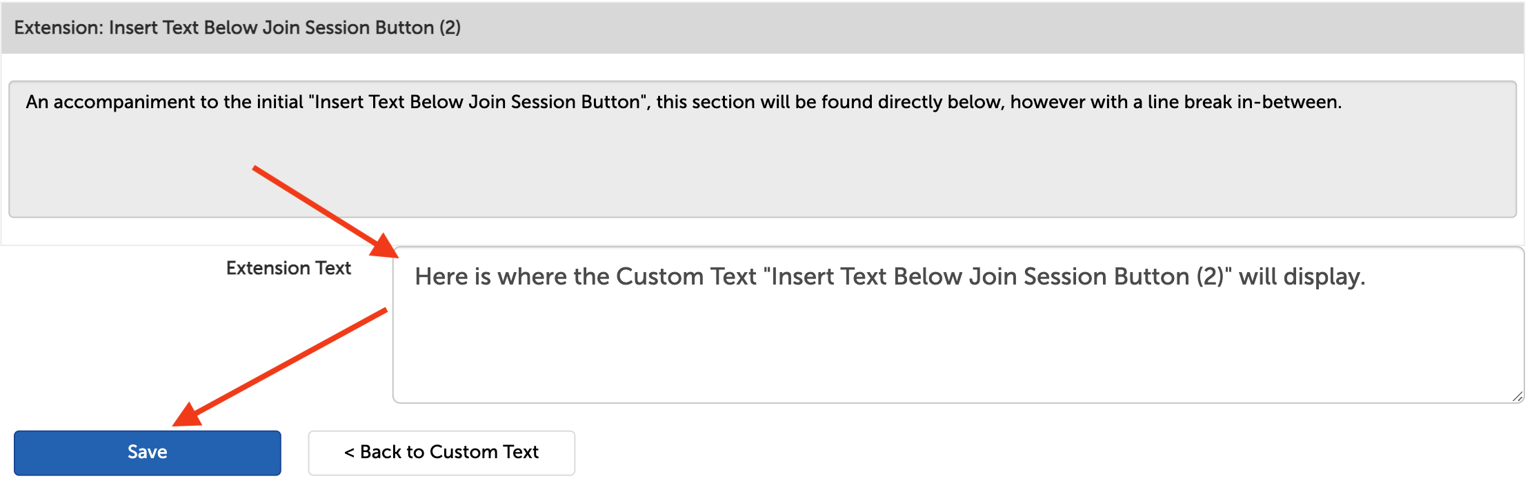 Meant as an accompaniment to the first "Insert Text Below Join Session Button" (though not required), the text entered here will be shown after a line break between the two sections.