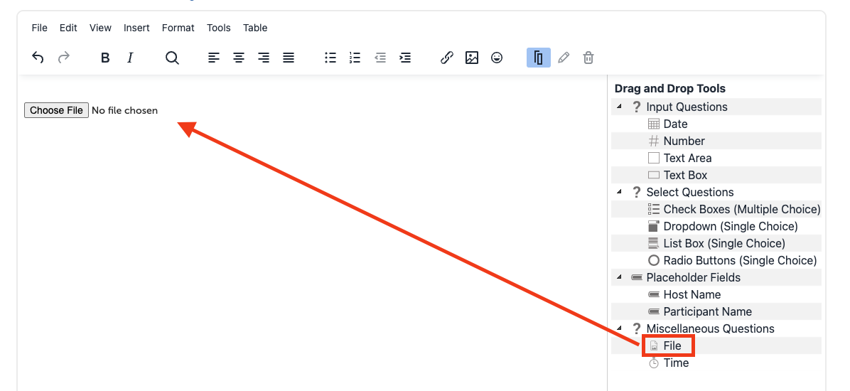 1. Click on and hold the "File" field on the right hand side, drag it to where you would like the field to appear in the document.