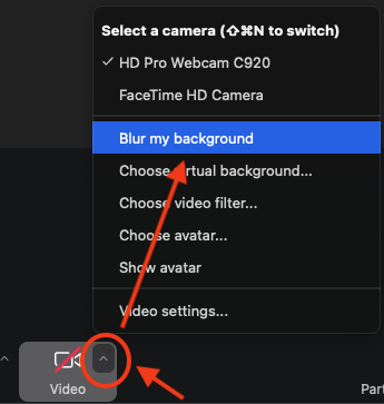 1. While in a Zoom meeting, click the upward arrow on the Video icon and select "Blur Virtual Background"