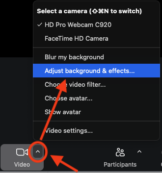 1. While in a Zoom meeting, click the upward arrow on the Video icon and select "Adjust background & effects..."