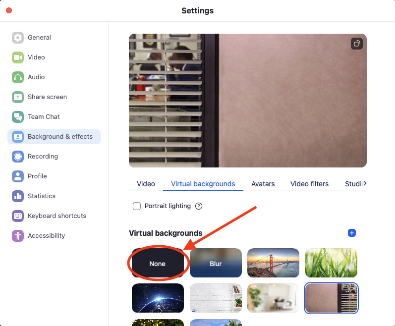 2. This will bring you straight to the "Background & effects" section of the Settings. Here you will be able to select "None" to remove any applied virtual background or blurring.